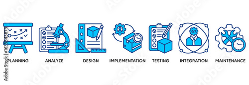 Software development icon set vector illustration concept relate to planning, analyze, design, implementation, testing, integration, and maintenance