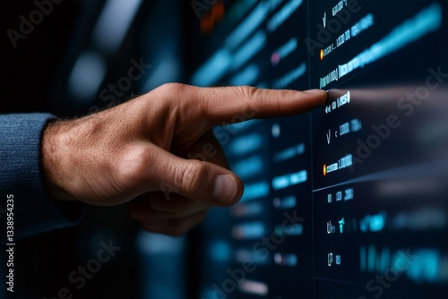 Software engineer pointing at computer screen showing lines of code
