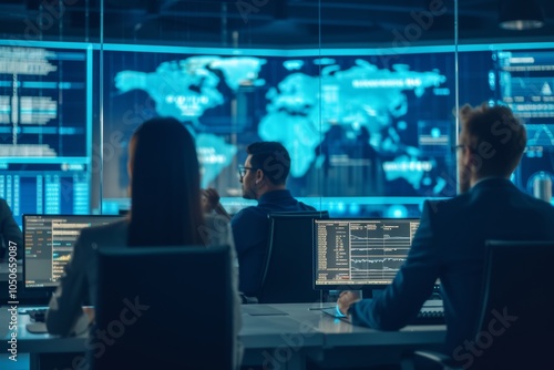 Software engineers collaborate in a modern monitoring environment analyzing data and metrics on large screens