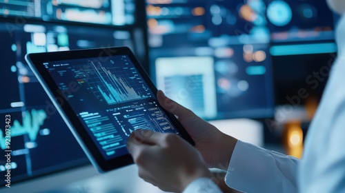 Software engineers manage big data with digital tablets, utilizing AI and advanced digital technology
