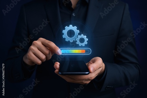 Software Update Concept: Man Holding Smartphone with Installation Process and Gear Icons Overlayed