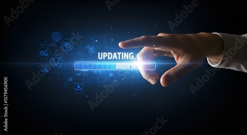 Software Update Installation: Hand Activating Progress Bar on Digital Screen, Technology Upgrade Concept, Blue Futuristic Design