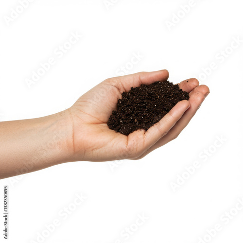 Soil for plants in your hand on a white background. A symbol of growth, ecology, agriculture, natural balance and sustainable development.
