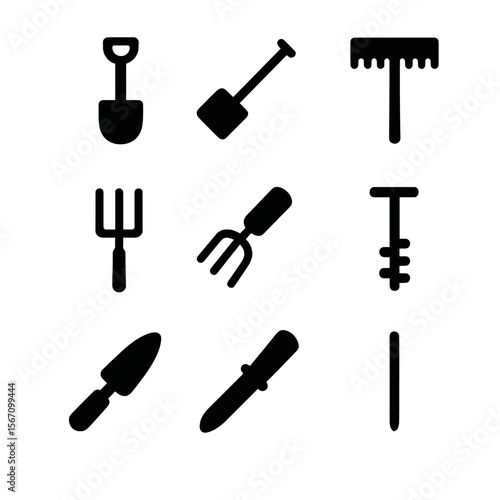 Soil Tool Icons. Solid, filled icon set of agricultural soil tools: spade, hoe, rake, pitchfork, hand tiller, soil auger, trowel,