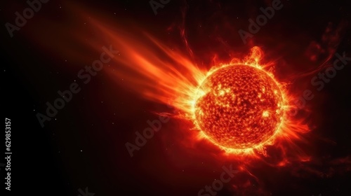 Solar flare in Sun black space background, eruption of electromagnetic radiation in Sun atmosphere, solar flare coronal mass ejections in space, meteorological dependence concept, generative AI