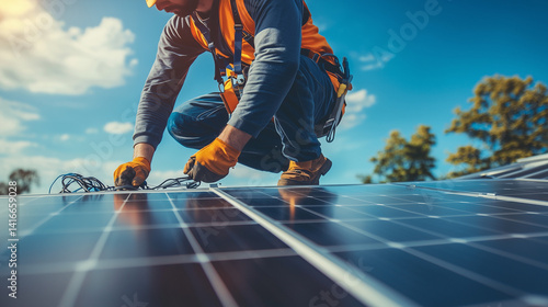 Solar installer connecting cables to panel during rooftop photovoltaic system setup for sustainable energy use