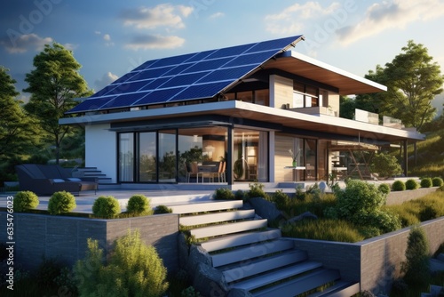 Solar panel on modern new house with swimming pool. Economical and environmentally friendly heating and lighting system for your comfort