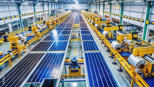 Solar Panel Production Line with Robot Arms in Modern Factory Setting