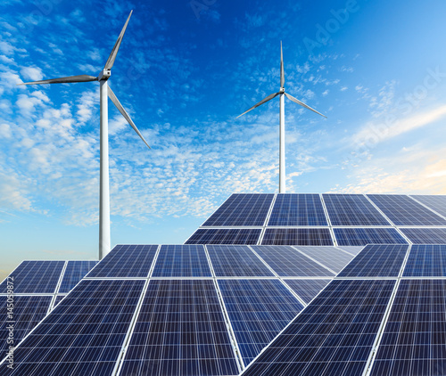 solar panels and wind generators under blue sky