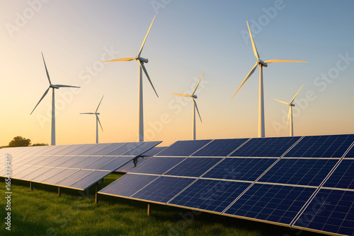 Solar panels and wind turbines in a field under a clear sky with a soft sunset glow solar energy wind energy