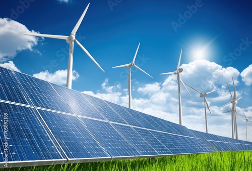 Solar panels array and wind turbines under a bright blue sky with puffy clouds, set in lush green grass field