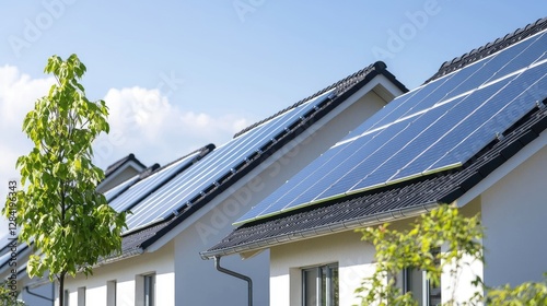 Solar panels on modern homes under a partly cloudy sky. Use for showing sustainable living