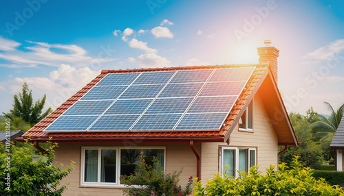 solar panels on roof of house, renewable energy, dinamic scene, with white tones