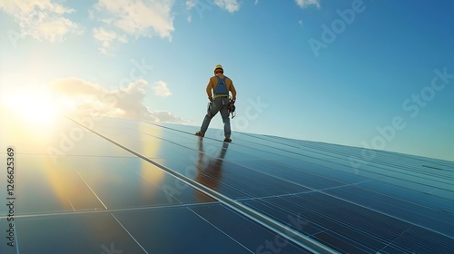 Solar power engineer installing solar panels