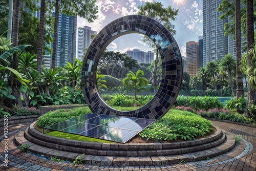 Solar Power Oasis. Circular solar panel installation in an urban park, surrounded by lush greenery and skyscrapers.