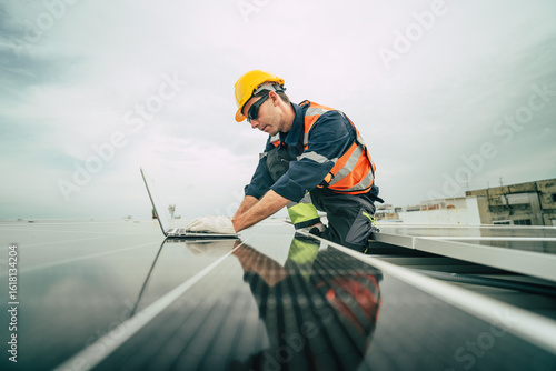 Solar technician performing maintenance on photovoltaic panels while using a laptop on a rooftop under a cloudy sky