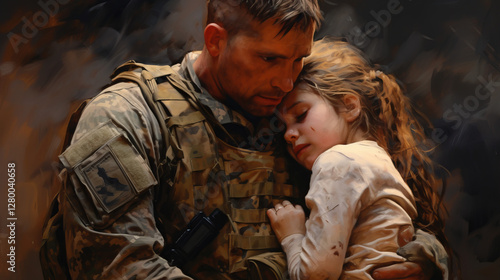 Soldier hugging sad little daughter while leaving for war. A man rescues and calms a frightened child during the fighting.
