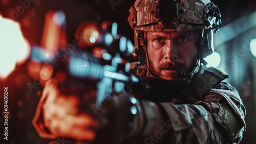 Soldier sighting down a rifle scope with fierce determination amidst explosive action.