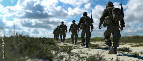 Soldiers walk through grassy dunes under a bright sky, evoking camaraderie and purpose as they navigate the natural landscape.