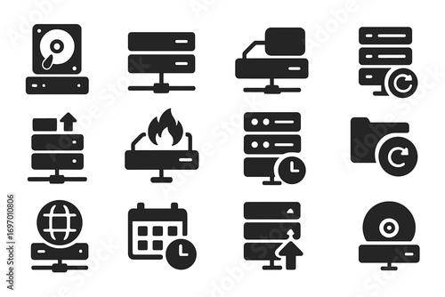 Solid Backup Icons. Solid style icons of backup servers: hard drive on server icon, mirrored server symbol, snapshot tray,