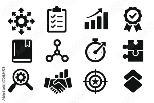 Solid best practices icons. Includes achievement goals, audit, integration, procedures, handshake and teamwork. Minimal corporate vector collection.