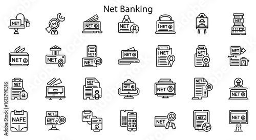 Solid Black Net Banking Icons: Online Finance, Digital Payments, and Security Symbols