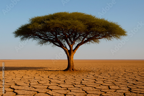 Solitary Acacia Tree Standing in Wide Open Cracked Desert with Warm Sunlight and Clear Blue