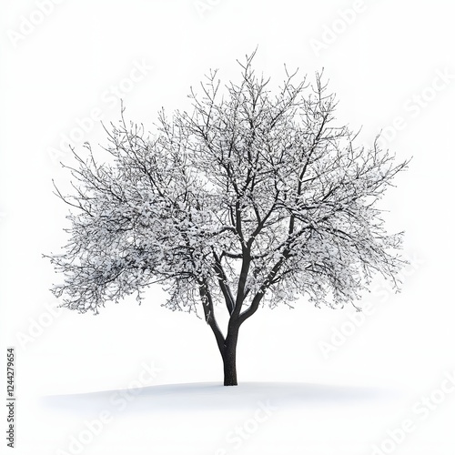 Solitary Bare Tree Covered in Snow on Plain White Background