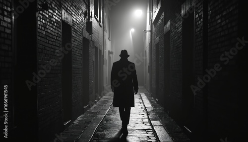 Solitary, cloaked figure walks down dark, foggy urban alleyway at night. Illuminated by distant streetlamp, mysterious silhouette moves away from viewer, creating suspenseful, atmospheric scene.