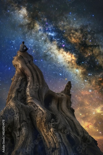 Solitary figure atop dry tree trunk gazes at vast universe, filled with wonder and awe under