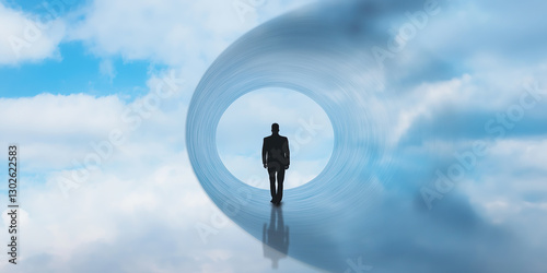 Solitary Figure Crossing Ethereal Gateway Toward Boundless Celestial Horizons