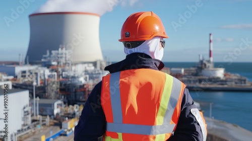 Solitary Figure in a Gigantic World: A worker in a protective suit stands in awe before a massive industrial turbine, the vast scale of the nuclear power plant dwarfing the human form.symbolizing the