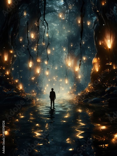Solitary Figure in an Enchanting, Luminescent Forest Path
