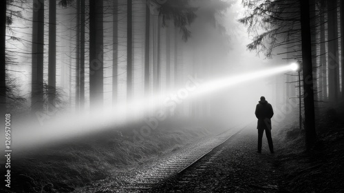 Solitary Figure in Dark Tunnel with Light Beam Piercing Foggy Forest