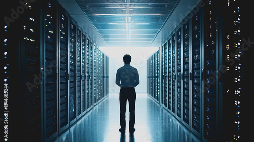 Solitary Figure in Data Center Surrounded by Server Racks with Glowing Lights and Digital Technology Atmosphere