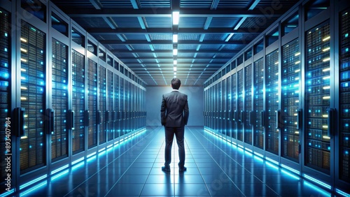 Solitary figure stands amidst rows of humming servers and workstations in a vast, dimly lit, high-tech IT operations center.
