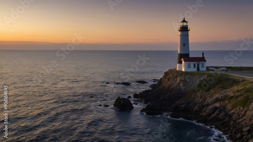 Solitary lighthouse stands tall against golden sky, beacon of hope amidst crashing waves on rocky coast