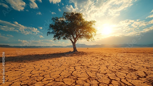 Solitary Tree in a Vast Desert Landscape at Sunset