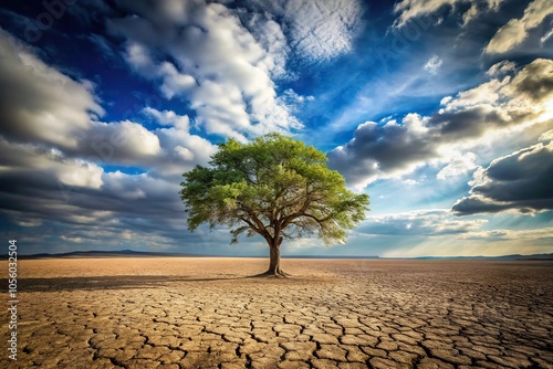Solitary tree in barren cracked landscape under partly cloudy sky, tilted angle