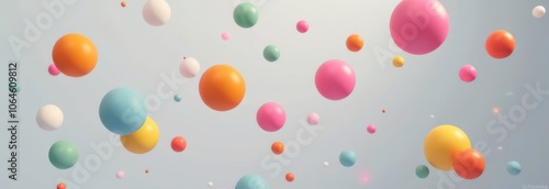 Some floatig colorful 3d spheres, without patterns, arranged against a light gray background.