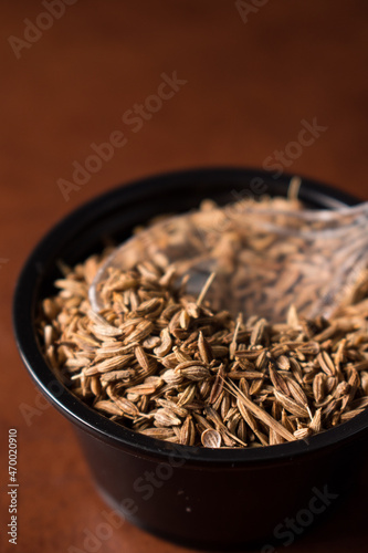 Some little cumin seeds in pot with a little plastic spoon in a grain storage