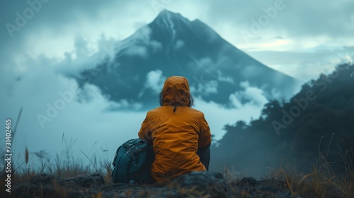 someone is sitting facing the mountain