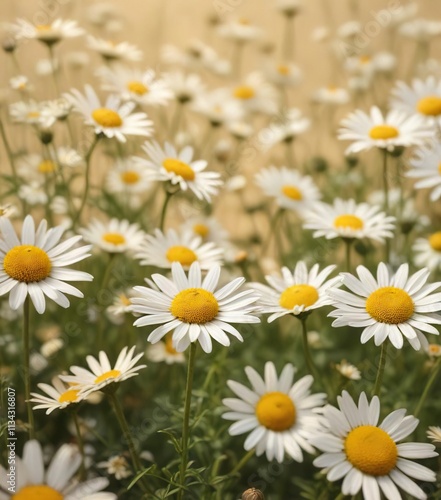 Soothing chamomile daisy fields on a warm beige background, flowers in field, relaxed atmosphere, chamomile