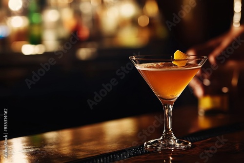 Sophisticated Cocktail in an Elegant Martini Glass with Orange Hue Reflection Held by Two Hands on a Dark Wooden Bar Table with Out-of-Focus Background Elements