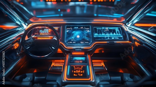 Sophisticated Holographic Dashboard of a Sleek Modern Autonomous Car Interior Showcasing Advanced Futuristic Vehicle Technology and Digital Controls
