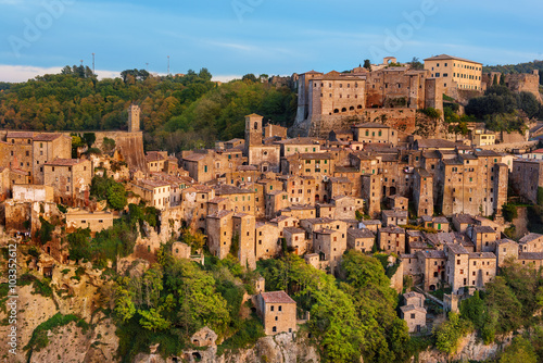 Sorano - tuff city in Tuscany. Italy. View in the dusk, travel background