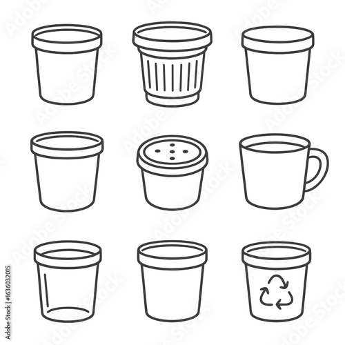 Soup Cup Icons. Line vector icons of Soup take-away cups: paper soup cup, plastic soup cup, foam soup cup, double-wall soup cup,