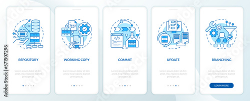 Source control parts blue onboarding mobile app screen. Code writing walkthrough 5 steps editable graphic instructions with linear concepts. UI, UX, GUI template. Myriad Pro-Bold, Regular fonts used