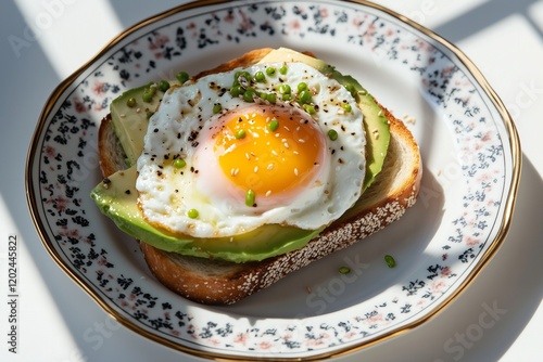 sourdough bread toast with avocado and poached egg on top of floral print glazed plate, dramatic shadows