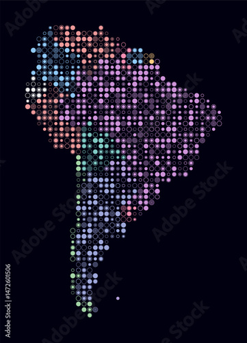 South America, shape of the continent build of colored cells. Digital style map of the South America on dark background. Small size circle blocks. Classy vector illustration.